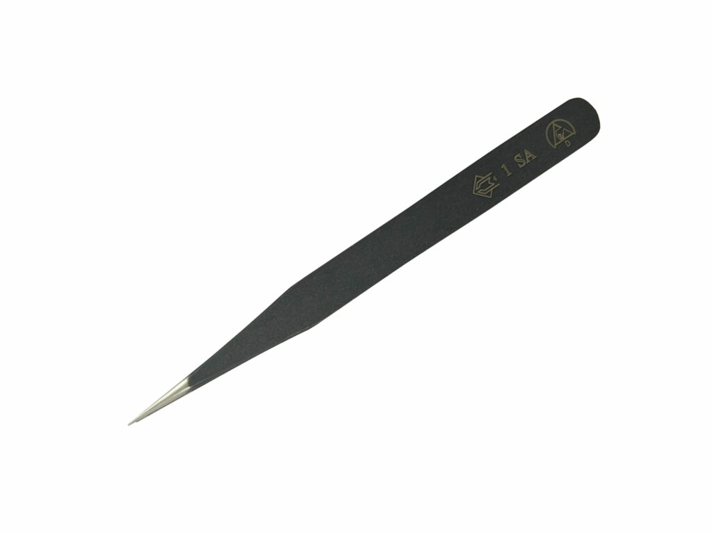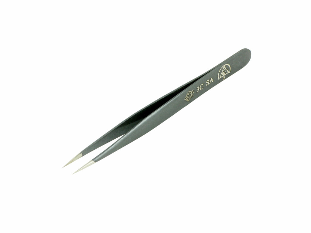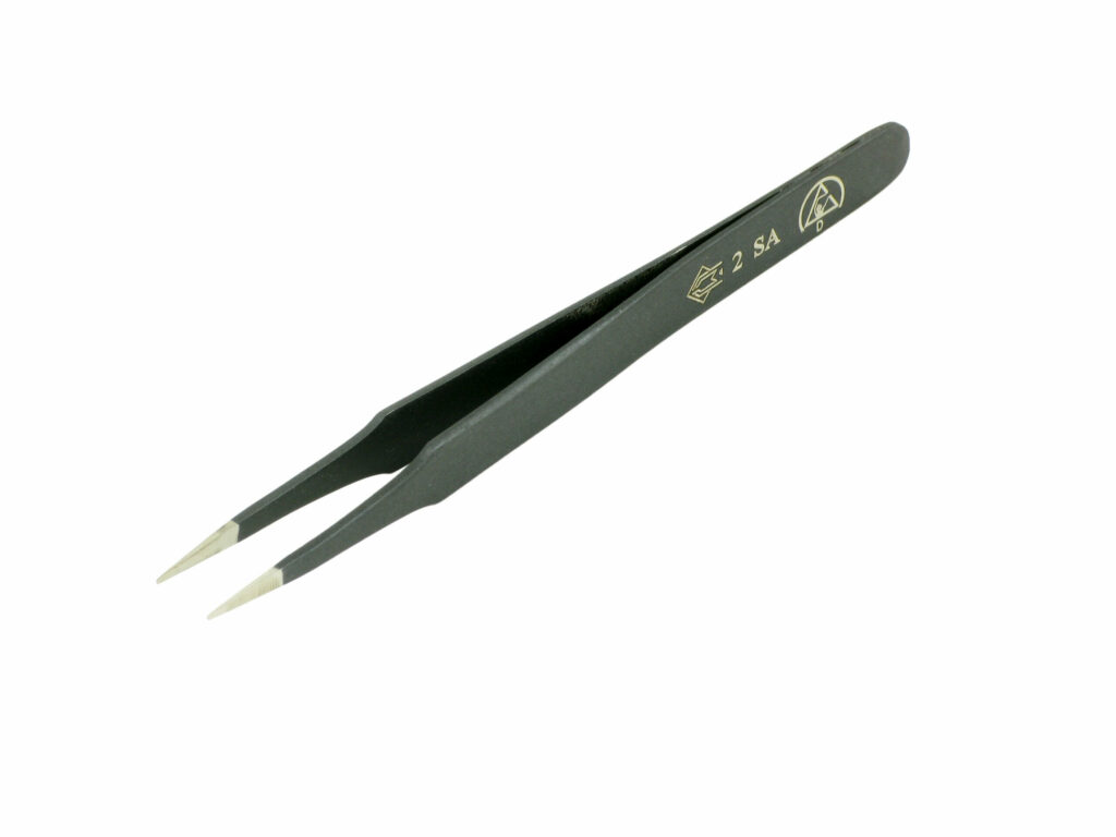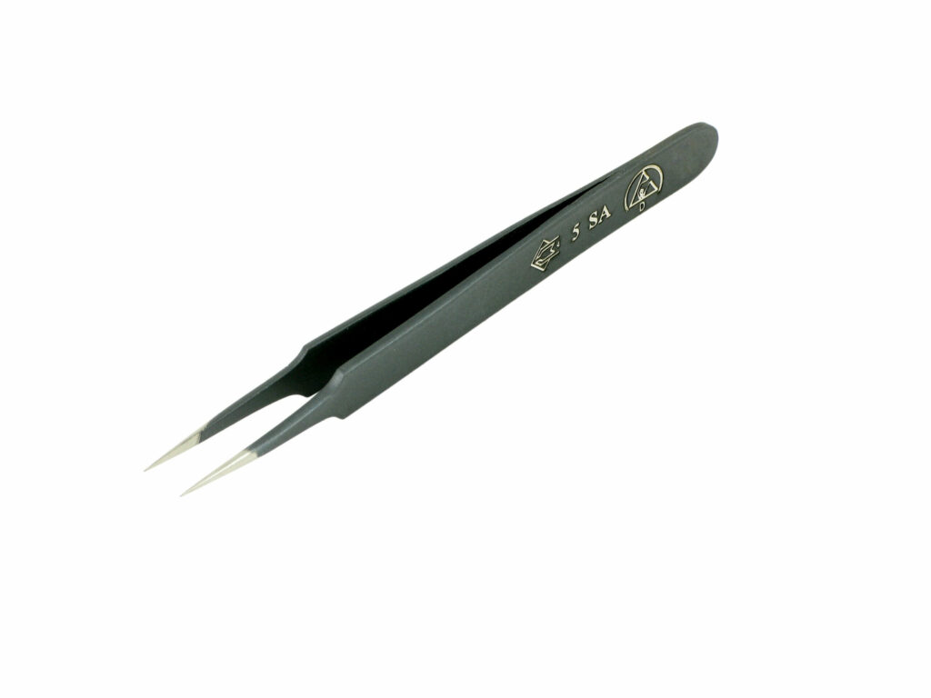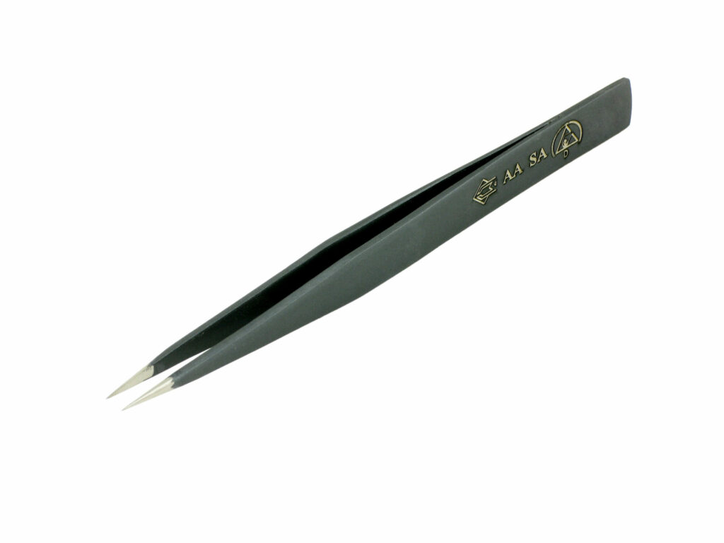 Tweezers with very fine and sharp tips, ideal for SMD applications.