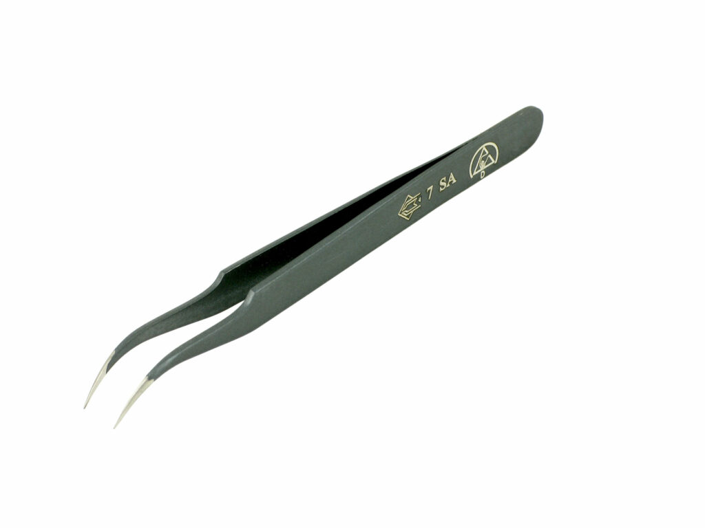 Tweezers with very fine curved tips for easy gripping in tight spaces.
