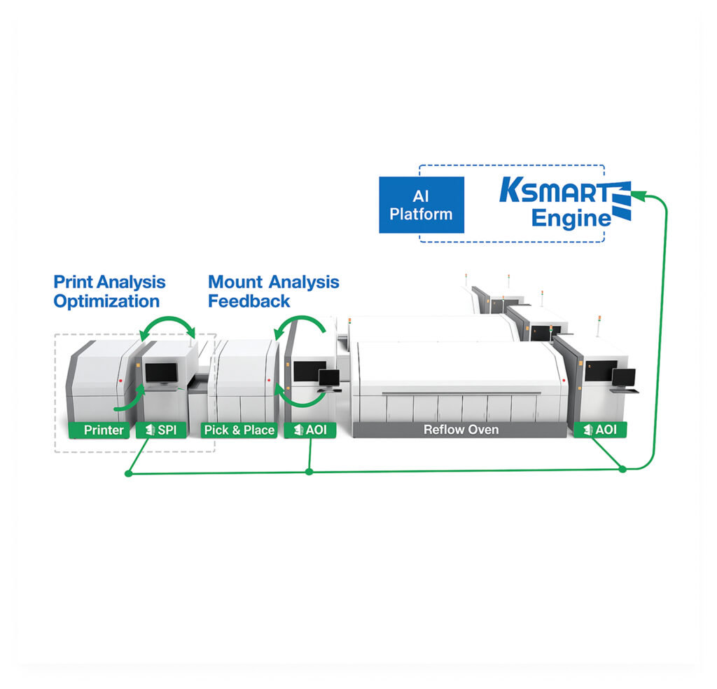 Les solutions d’usine intelligente KSMART révolutionnent l’optimisation des processus et garantissent les plus hauts standards de qualité et de fiabilité sur la chaîne de production. KSMART collecte les données d’inspection et de mesure de tous les équipements via son serveur KSMART et les exploite partout sur le réseau grâce à une interface utilisateur intuitive. Détection des défauts, optimisation en temps réel, prise de décision optimisée et traçabilité sont ainsi assurées. L’objectif est d’améliorer les indicateurs, d’accroître la qualité des cartes et de réduire les coûts en éliminant les écarts, les faux appels et les fuites