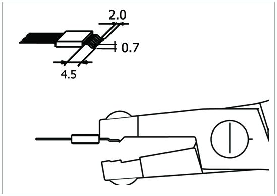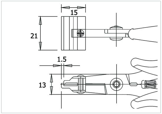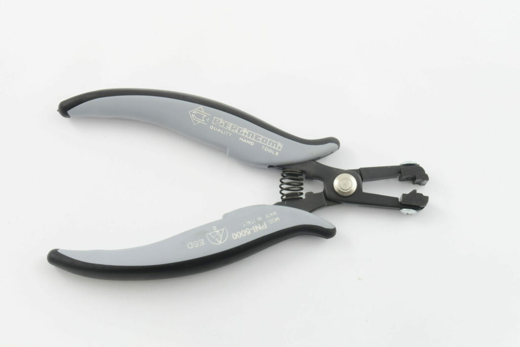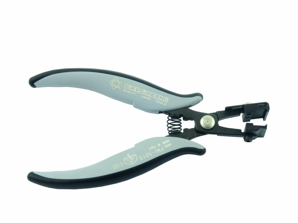 Special pliers for a clean cut on an entire row of pins, at a predetermined adjustable height from the surface. The cutting length can be adjusted using the adjustable stop (min. 1.5mm – max. 10mm). Steel thickness 5 mm. Tool length 155 mm. ESD-safe handles. Grip model St.