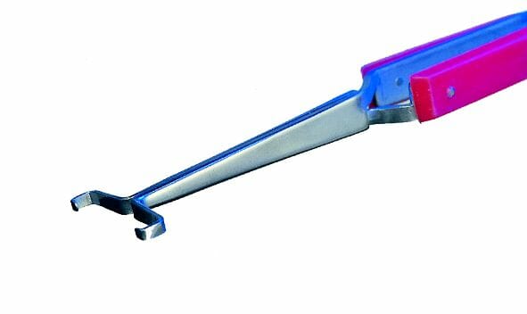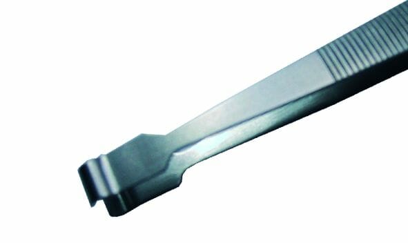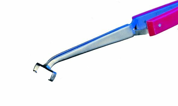 Tweezers with fine hook-shaped tips.