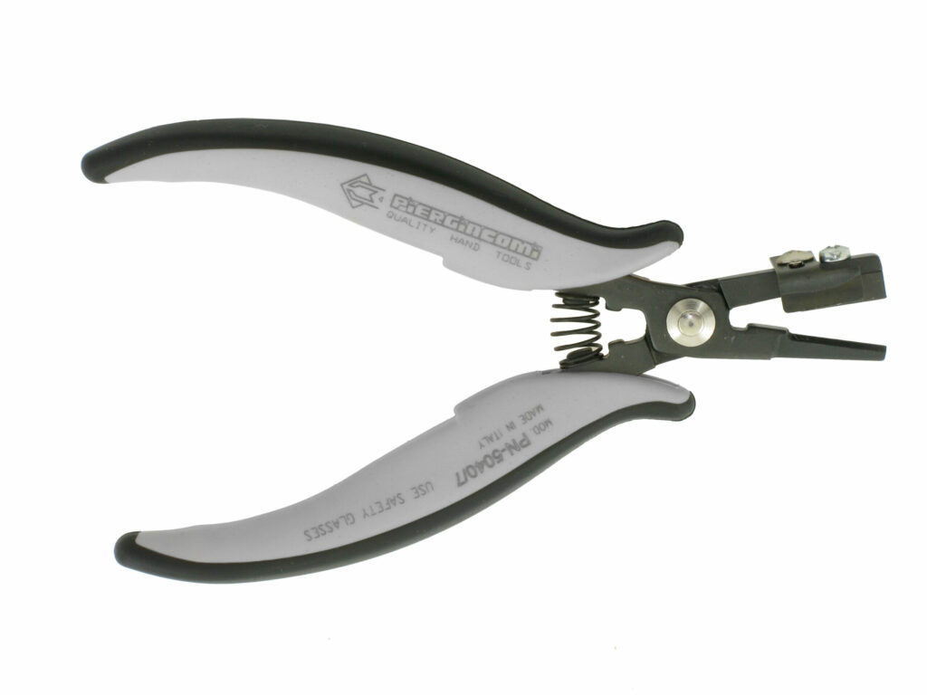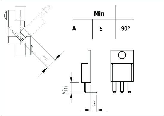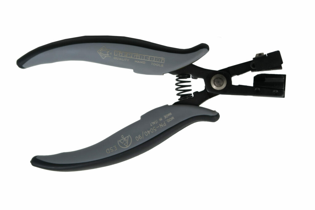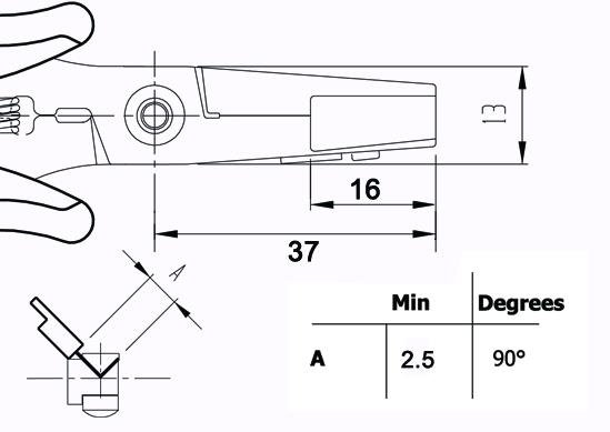 Special pliers used to bend the leads to 90°. With adjustable stop to adjust the forming distance (A). Max. forming width 16 mm, suitable for forming TO220 and TO247 components and other types of components. Steel thickness 5 mm. Tool length 158 mm. ESD-safe handles. Grip model St.
