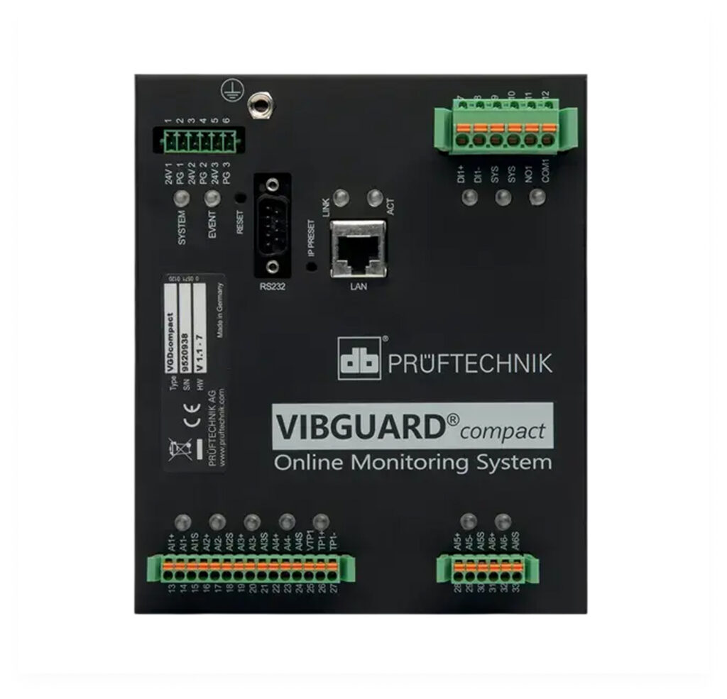 Le VIBGUARD compact offre six canaux de mesure pour une surveillance continue. Il est parfaitement adapté aux équipements rapides et hautement dynamiques. Il répond notamment aux exigences des équipements critiques caractérisés par une disponibilité élevée, des valeurs agrégées élevées, des entraînements complexes et des conditions d’exploitation variables.